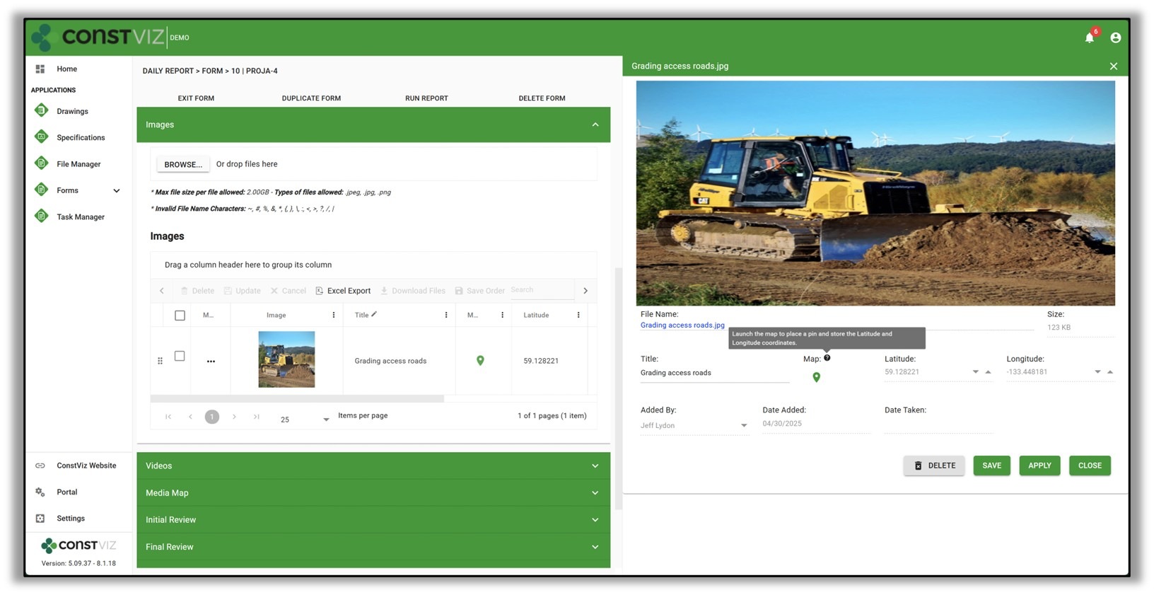 While assigning a default latitude and longitude for images and videos is a big time saver, Construction Viz also includes an interactive geolocation feature where users can move a pin to the exact location on a modal map. This custom geolocator can be especially handy if no existing latitude and longitude data is associated with the files, and you are back at the office completing your report.