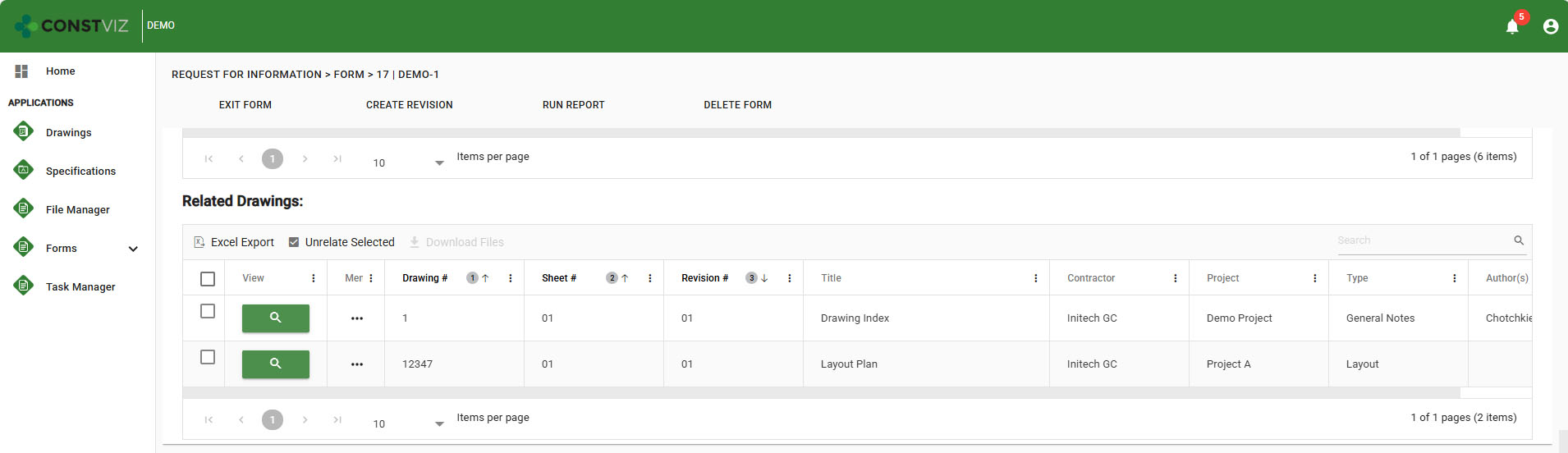 Construction forms such as RFIs frequently reference drawings. Unfortunately, searching for an RFI to find a drawing or vice versa can be cumbersome in a PMIS.